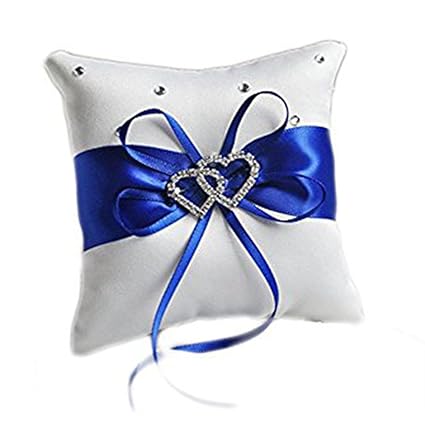 Hosaire Ring Bearer Pillow 4 X 4 Inches Bow Rhinestone Double Heart Ring Pillow Wedding Decoration Blue